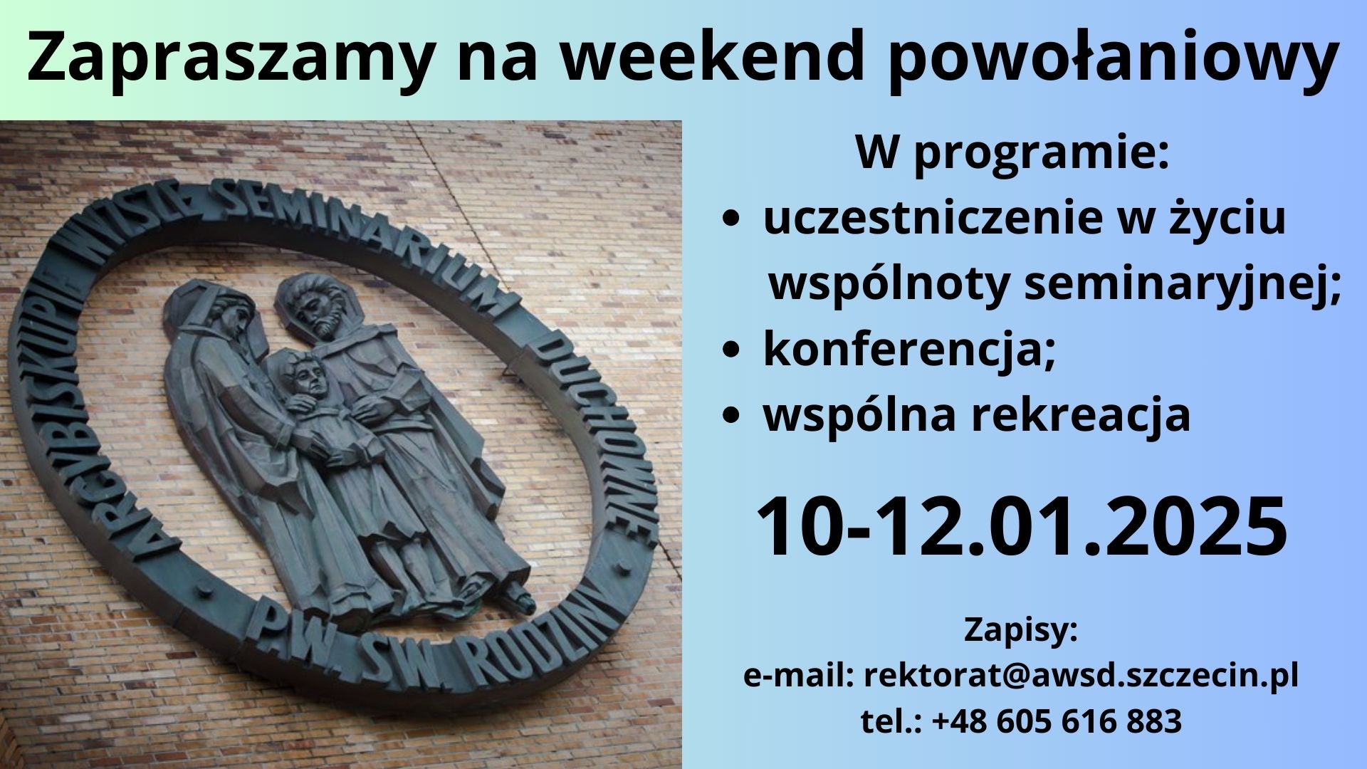 Zapraszamy uczniów szkół średnich i starszych (mężczyźni) na kolejną edycję Weekendu powołaniowego. Spotkanie odbędzie się w dniach 10-12.01.2025 r. w naszym seminarium. Przyjazd i zapisy do godz. 17.30. zakończenie w niedzielę po obiedzie. W czasie weekendu nasi goście biorą udział w życiu seminarium: wspólnej modlitwie, konferencji, posiłkach, pracy i rekreacji. [...]